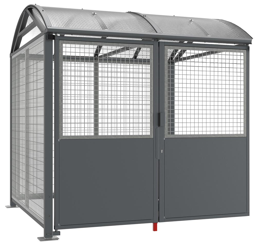 · Für das sichere Parken von Fahrrädern, Rollern, und Motorrädern · Robuste Stahlpfosten sowie das feuerverzinkte Stahlgitter für eine effektive und langlebige Lösung, um das Risiko des Diebstahls von Zweirädern zu verringern · Gestell aus Stahlposten 80 x 80 mm, beschichtet in grau, Dach aus Stahlträger 60 x 40 mm, Regenrinne aus Aluminium · Bogendach aus durchsichtigem Poycarbonat, Stärke 10 mm, mit UV-Schutz · Bogendach seitlich verstärkt gegen Diebstahl und Vandalismus · Stahlgitter feuerverzinkt · Seiten- und Rückwandverkleidungen aus Stahlgitter Ø 5 mm, auf Stahlrahmen geschweißt · Doppeltüre: Oberer Teil aus Stahlgitter Ø 5 mm, unterer Teil aus Stahlblech, 1,5 mm stark · Öffnung von Innen auch ohne Schlüssel möglich · Sicherung der Türposition durch Riegel · Montage erfolgt auf Bodenplatten, Spreizdübel inbegriffen, Pfosten höhenverstellbar