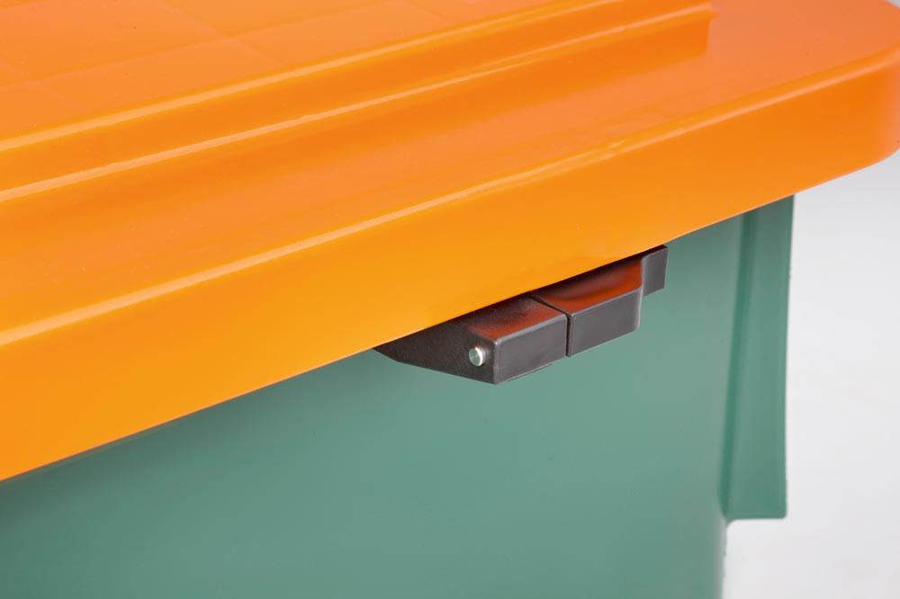 Universal- und Streugutbehälter aus HDPE, Korpus grün, Deckel orange, abschließbar, ohne Entnahmeöffnung, AuffangVol. 210 l, BxTxH 790x605x775 mm