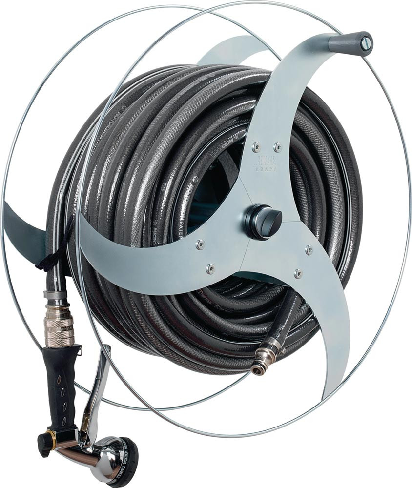 einfache Montage · schnelle Bedienung · aus langlebigen und umweltfreundlichen Materialien · einzigartiges und geschütztes Turbo-Design · breite Auflagen schonen den Schlauch · mit einem Wandabstand wie ein gewöhnlicher Schlauchhalter · stabile Wandkonsole für sicheren Halt · mit Abrollbremse · Ø 427 mm · Tiefe 215 mm · Gewicht ohne Schlauch: 3,5 kg