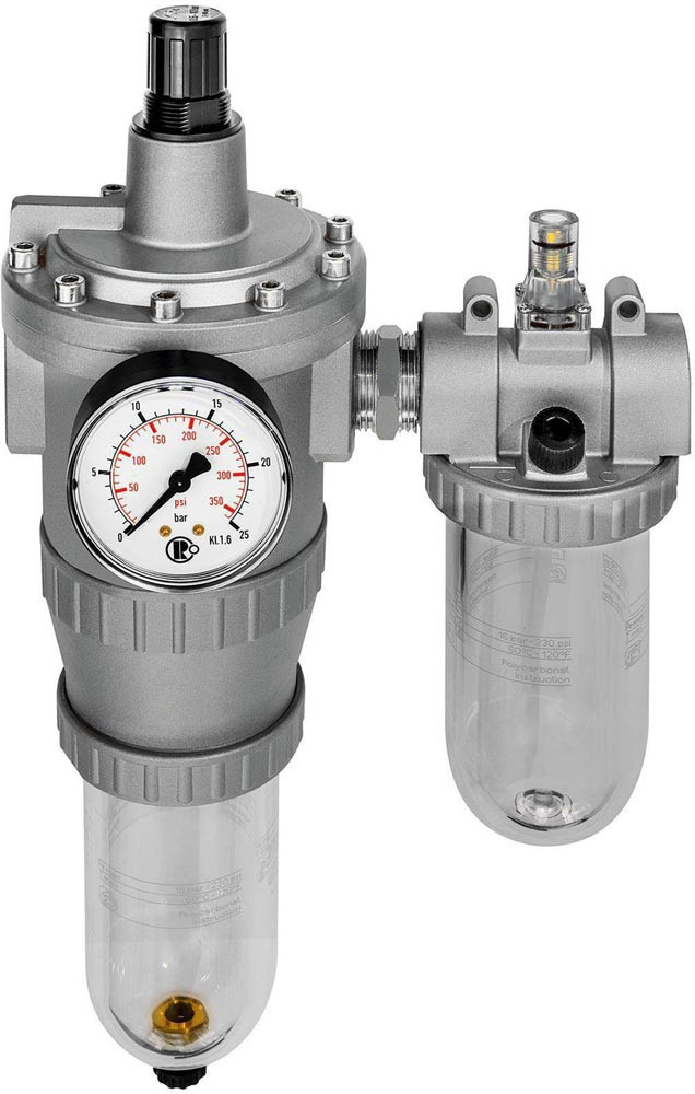 Standard · zweiteilig, bestehend aus einem vordruckunabhängigen, rücksteuerbaren Membrandruckregler mit Sekundärentlüftung in Verbindung mit einem Zentrifugalabscheider und einem Proportionalöler · mit Polycarbonatbehälter · Innengewinde