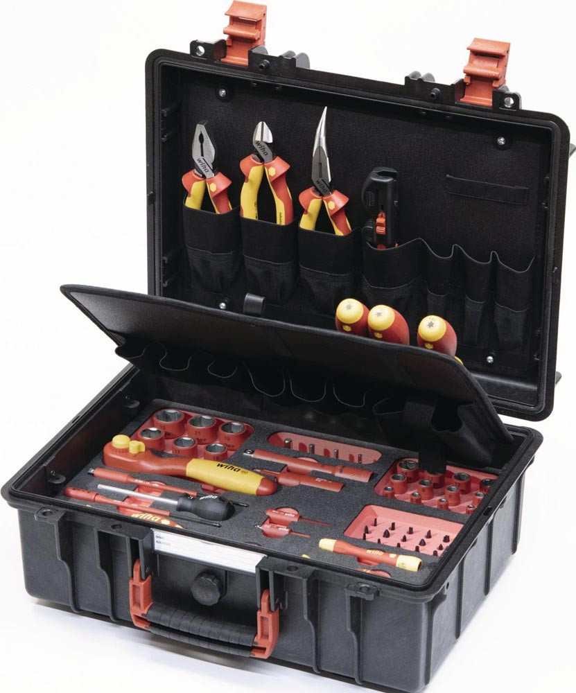 1x Seitenschneider Industrial electric mit DynamicJoint® 160 mm · 6 1/2″ (43336) 1x Kombizange Industrial electric mit DynamicJoint® und OptiGrip mit extra langer Schneide 180 mm · 7″ (33186) 1x Flachrundzange Industrial electric mit Schneide gebogene Form · ca. 40° 200 mm · 8″ (35462) 1x Abisolier-Multitool für Rundkabel 125 mm · 5″ (44242) 1x Schraubendreher SoftFinish® electric slimFix TORX® T27 x 125 mm (36540) 1x Schraubendreher SoftFinish® electric slimFix TORX® T30 x 125 mm (36541) 1x Schraubendreher SoftFinish® electric slimFix TORX® T40 x 150 mm (36542) 1x Ratschenschlüssel isoliert für Steckschlüssel 3/8″ umschaltbar 200 mm (43052) 1x Verlängerung isoliert 3/8″ für Steckschlüsseleinsätze isoliert 125 mm (43057) 1x Vierkant-Adapter isoliert 3/8“ für 1/4″ Steckschlüssel (44355) 1x Schraubendreher mit Bithalter Set SoftFinish® slimVario® electric 4-tlg. mit slimBits auf SB-Karte (43449) 1x Feinschraubendreher Set PicoFinish® slimVario® electric 4-tlg. mit slimBits (43167) 1x Schraubendreher mit Bithalter SoftFinish® electric slimVario Stubby für slimBits 6,0 mm (41229) 1x Verlängerung slimVario® electric für slimBits 6,0 mm x 69,5 mm (43292) 1x Adapter slimVario® electric für 1/4″ Steckschlüssel 59 mm (43139) 1x Drehmoment-Schraubendreher TorqueVario®-S electric variabel einstellbare Drehmomentbegrenzung 0.8 - 5 (26626) 1x Adapter TorqueVario-S electric für 1/4″ Steckschlüssel (43128) 1x Bit slimBit electric Schlitz 2,5 mm x 75 mm (34578) 1x Bit slimBit electric Schlitz mit Zapfen 3,5 mm x 75 mm (44385) 1x Bit slimBit electric Schlitz 4,0 mm x 75 mm (34580) 1x Bit slimBit electric Schlitz 5,5 mm x 75 mm (34581) 1x Bit slimBit electric Phillips PH1 x 75 mm (34583) 1x Bit slimBit electric Phillips PH2 x 75 mm (34584) 1x Bit slimBit electric Pozidriv PZ1 x 75 mm (34585) 1x Bit slimBit electric Pozidriv PZ2 x 75 mm (34586) 1x Bit slimBit electric PlusMinus/Pozidriv SL/PZ1 x 75 mm (34589) 1x Bit slimBit electric PlusMinus/Pozidriv SL/PZ2 x 75 mm (34590) 1x Bit slimBit electric TORX® T8 x 75 mm (35506) 1x Bit slimBit electric TORX® T10 x 75 mm (35507) 1x Bit slimBit electric TORX® T15 x 75 mm (35508) 1x Bit slimBit electric TORX® T20 x 75 mm (35509) 1x Bit slimBit electric TORX® T25 x 75 mm (36071) 1x Bit slimBit electric Sechskant 2,5 mm x 75 mm (37224) 1x Bit slimBit electric Sechskant 3,0 mm x 75 mm (37147) 1x Bit slimBit electric Sechskant 4,0 mm x 75 mm (37225) 1x Bit slimBit electric Sechskant 5,0 mm x 75 mm (37226) 1x Bit slimBit electric Sechskant 6,0 mm x 75 mm (37227) 1x Steckschlüsseleinsatz isoliert 1/4″ Außensechskant 4,0 mm x 42 mm (43088) 1x Steckschlüsseleinsatz isoliert 1/4″ Außensechskant 5,0 mm x 42 mm (43089) 1x Steckschlüsseleinsatz isoliert 1/4″ Außensechskant 5,5 mm x 42 mm (10102) 1x Steckschlüsseleinsatz isoliert 1/4″ Außensechskant 6,0 mm x 42 mm (43091) 1x Steckschlüsseleinsatz isoliert 1/4″ Außensechskant 7,0 mm x 42 mm (10103) 1x Steckschlüsseleinsatz isoliert 1/4″ Außensechskant 8,0 mm x 42 mm (43093) 1x Steckschlüsseleinsatz isoliert 1/4″ Außensechskant 9,0 mm x 42 mm (10104) 1x Steckschlüsseleinsatz isoliert 1/4″ Außensechskant 10,0 mm x 42 mm (43095) 1x Steckschlüsseleinsatz isoliert 1/4″ Außensechskant 11,0 mm x 42 mm (43096) 1x Steckschlüsseleinsatz isoliert 1/4″ Außensechskant 12,0 mm x 42 mm (10105) 1x Steckschlüsseleinsatz isoliert 1/4″ Außensechskant 13,0 mm x 42 mm (43098) 1x Steckschlüsseleinsatz isoliert 1/4″ Außensechskant 14,0 mm x 42 mm (43099) 1x Steckschlüsseleinsatz isoliert 3/8″ Außensechskant 16,0 mm x 45 mm (43071) 1x Steckschlüsseleinsatz isoliert 3/8″ Außensechskant 17,0 mm x 45 mm (43072) 1x Steckschlüsseleinsatz isoliert 3/8″ Außensechskant 18,0 mm x 45 mm (43073) 1x Steckschlüsseleinsatz isoliert 3/8″ Außensechskant 19,0 mm x 47 mm (43074) 1x Steckschlüsseleinsatz isoliert 3/8″ Außensechskant 21,0 mm x 47 mm (43075) 1x Steckschlüsseleinsatz isoliert 3/8″ Außensechskant 22,0 mm x 47 mm (43076) 1x Steckschlüsseleinsatz isoliert 1/4″ Innensechskant 4,0 mm x 65 mm (43110) 1x Steckschlüsseleinsatz isoliert 1/4″ Innensechskant 5,0 mm x 65 mm (43111) 1x Steckschlüsseleinsatz isoliert 1/4″ Innensechskant 6,0 mm x 65 mm (43112) 1x Steckschlüsseleinsatz isoliert 1/4″ Innensechskant 8,0 mm x 65 mm (43113) 1x Koffer
