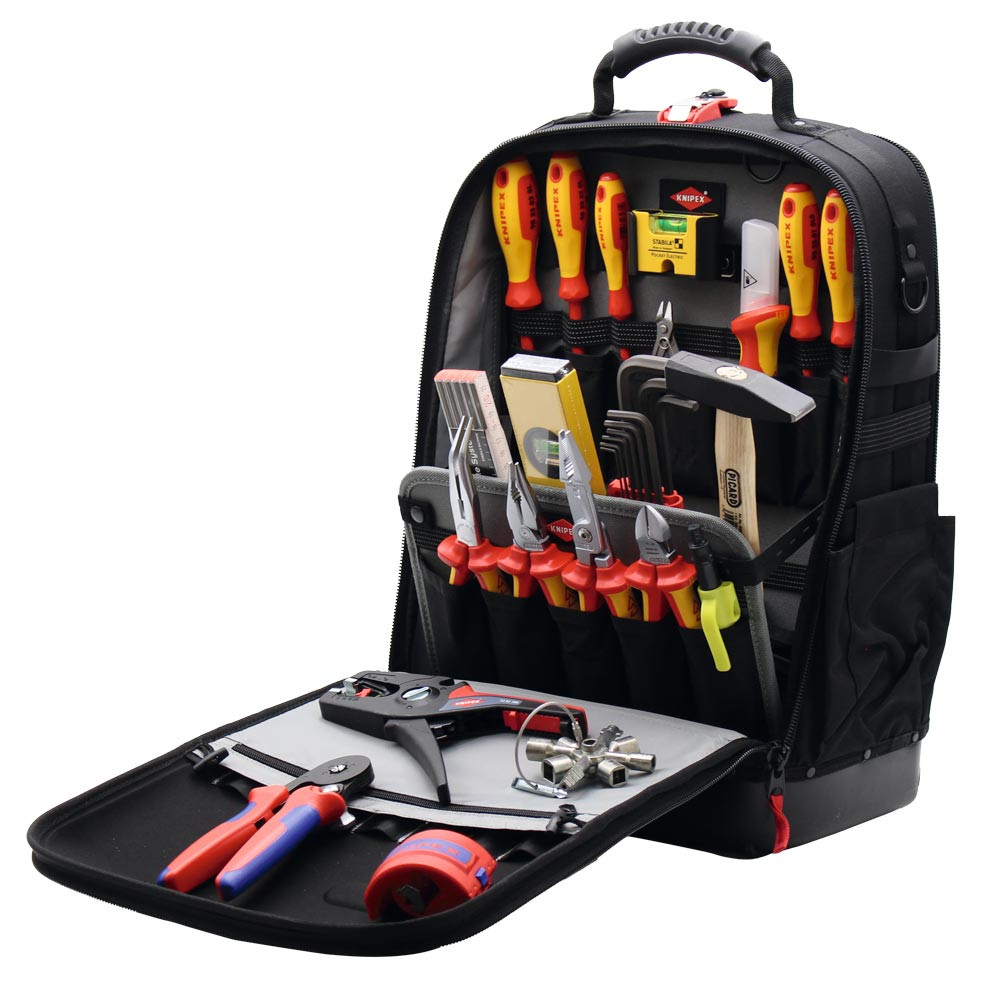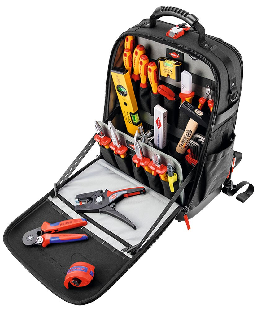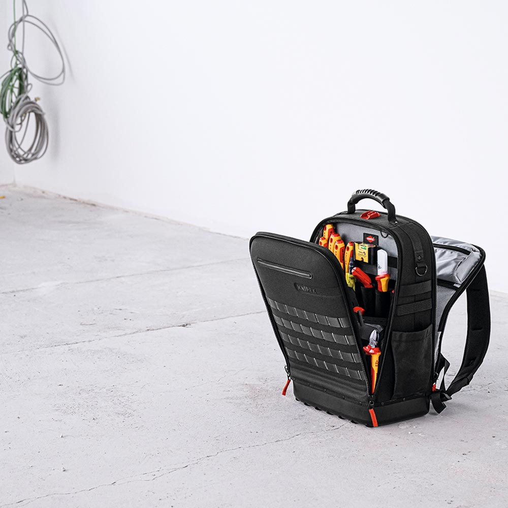Robuster Werkzeug-Rucksack für den mobilen Einsatz mit 23tlg. Premium-Werkzeug-Sortiment für den Elektriker ∙ Widerstandsfähiges und spritzwassergeschütztes Material ∙ Ergonomische Rückenpolsterung ∙ Leicht entnehmbare Werkzeug-Tafeln für die wichtigsten Werkzeuge ∙ Zwei separate Innenfächer für Werkzeug, Messgeräte, Notebook oder Tablet ∙ Wasserdichte Bodenschale aus schlagfestem Kunststoff für stabilen Stand ∙ Abmessung 530 x 340 x 210 mm (H x B x T)
